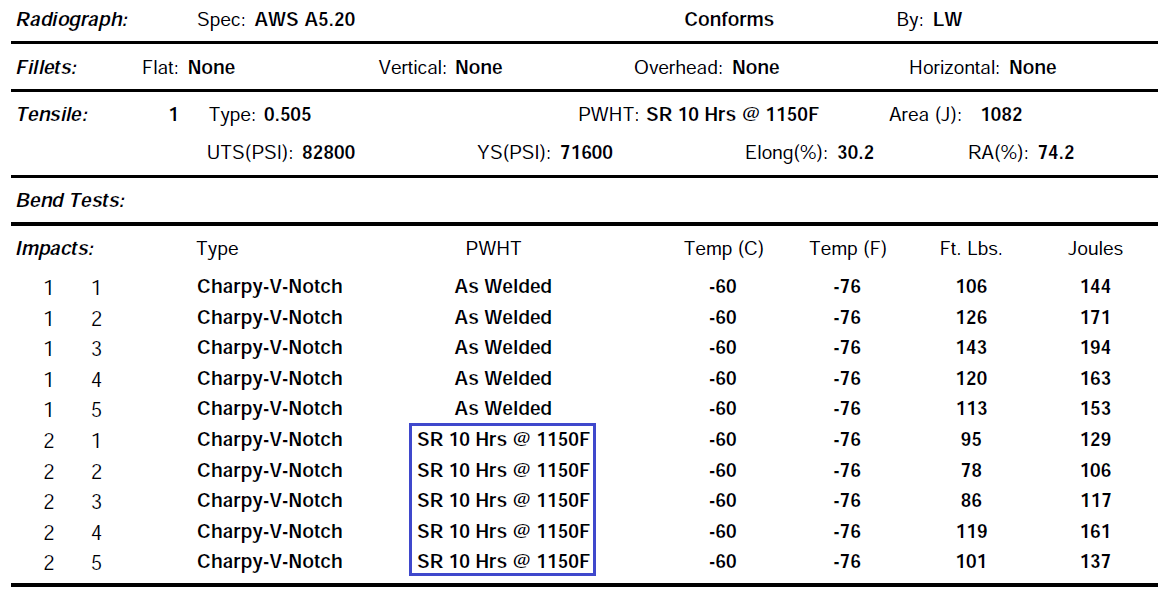 3、可满足焊后热处理620℃ 10-13小时, 依然满足-60℃的冲击要求和屈服抗拉的强度要求;